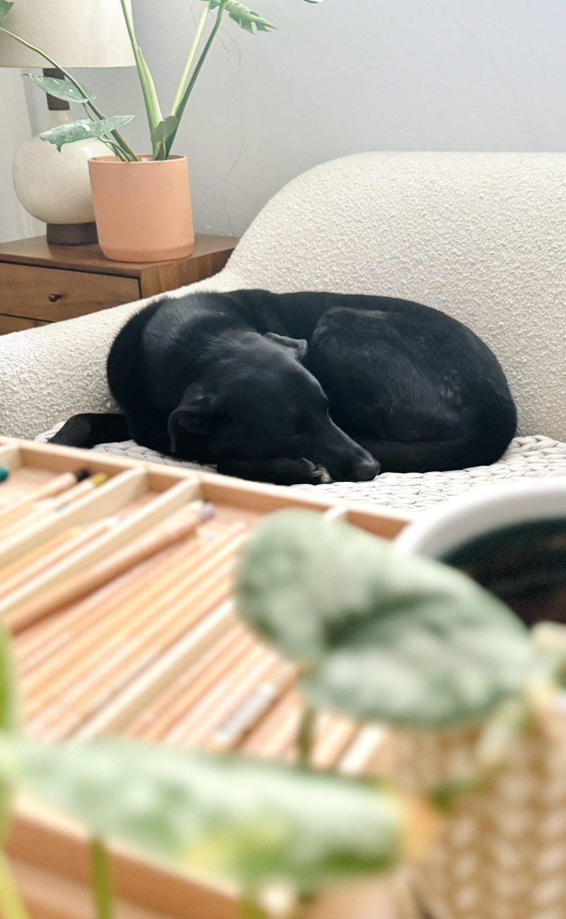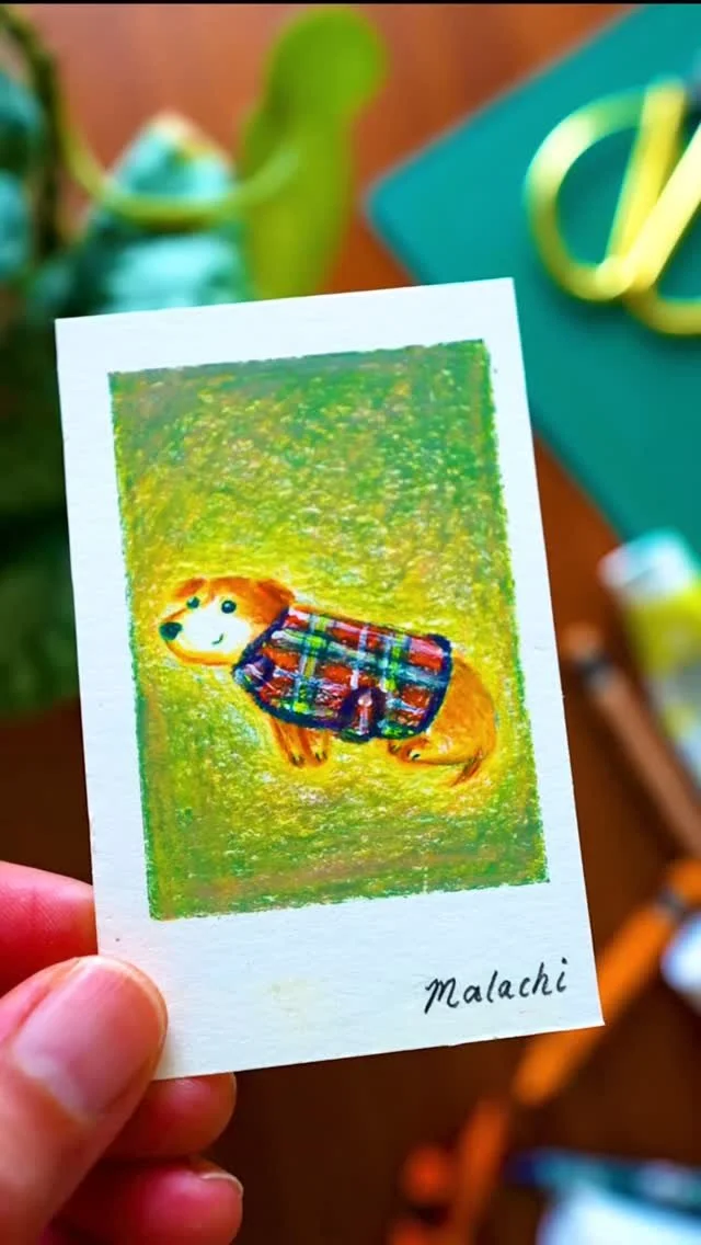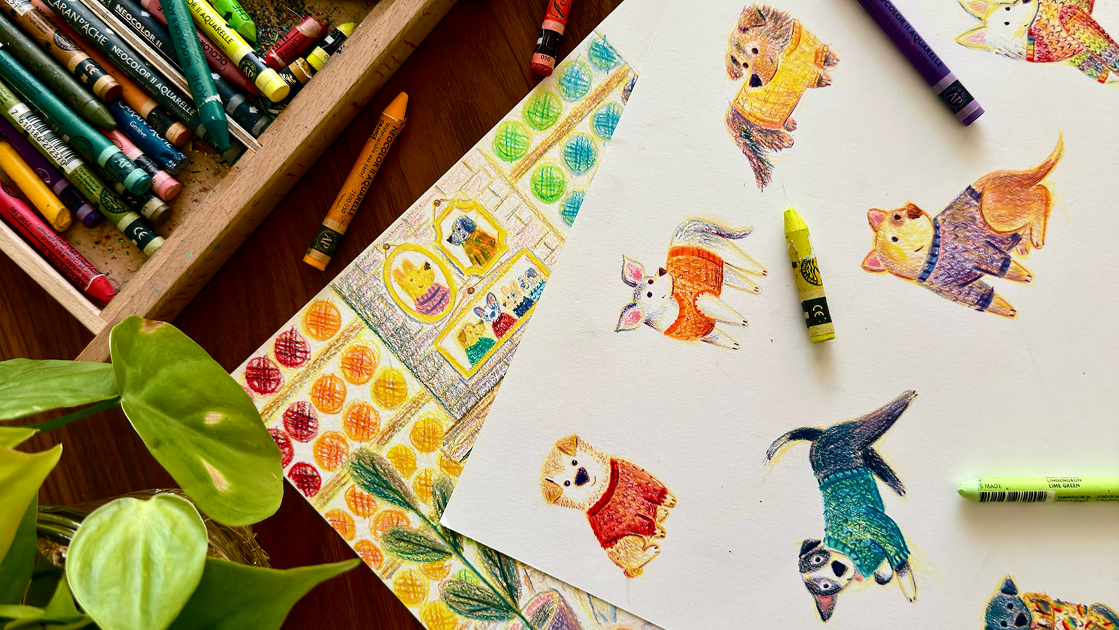 I love using traditional art materials, including wax pastels, gouache, and colored pencils.